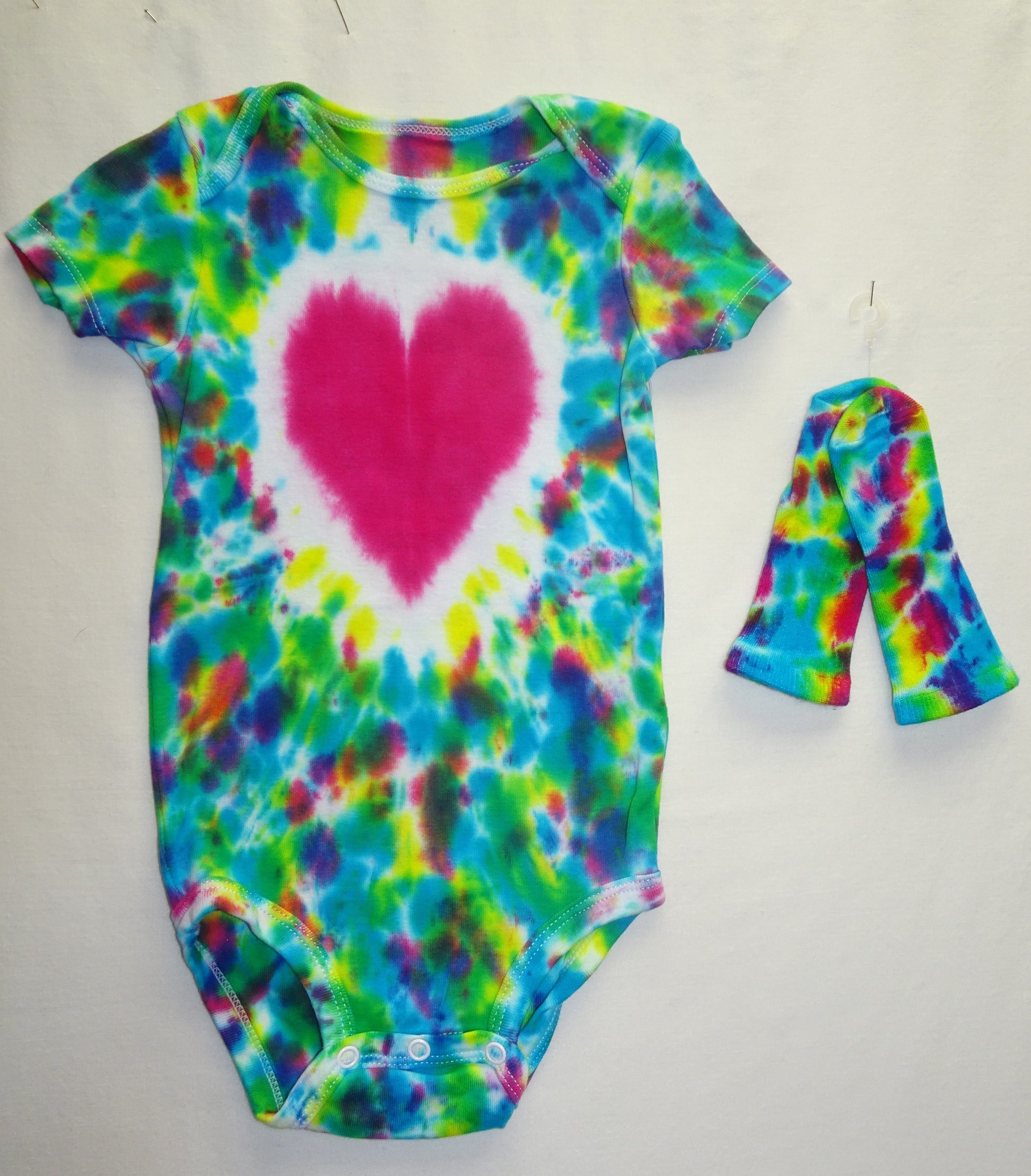 This is our heart design with a background using the primary colors (fuchsia, yellow, & turquoise) to make a full rainbow of colors. Available in infant one pieces with matching socks, toddler, youth, & adult sizes.