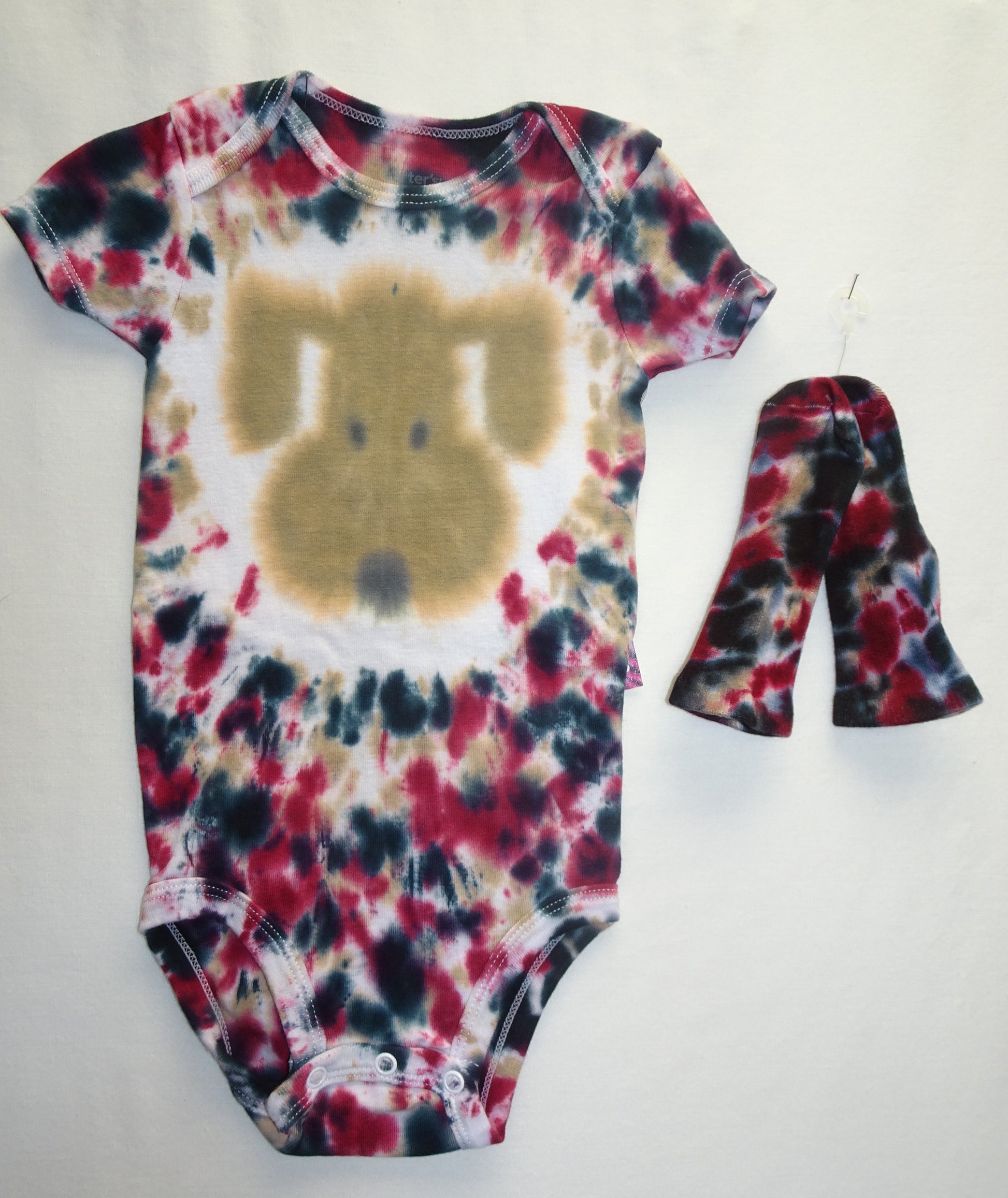 This is our puppy design with a background in maroon, black, & tan. Available in infant one pieces with matching socks, toddler, youth, & adult sizes.