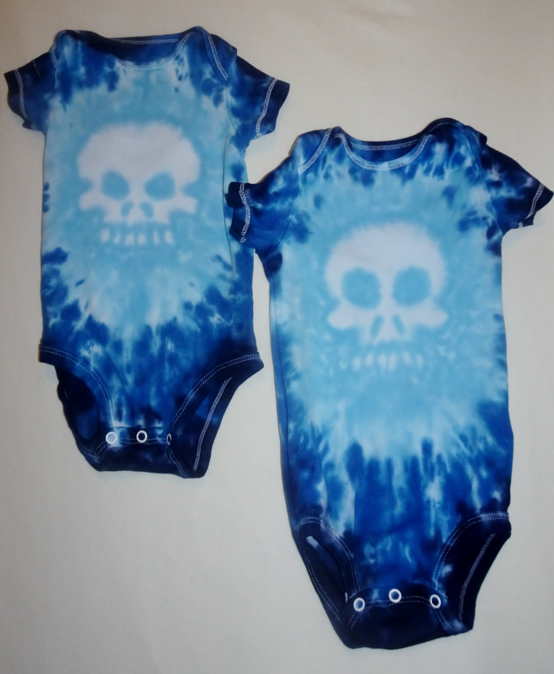 This is our skull without jaw design in a blues color scheme (light, medium, & dark blue.) Available in infant one pieces with matching socks & toddler sizes.